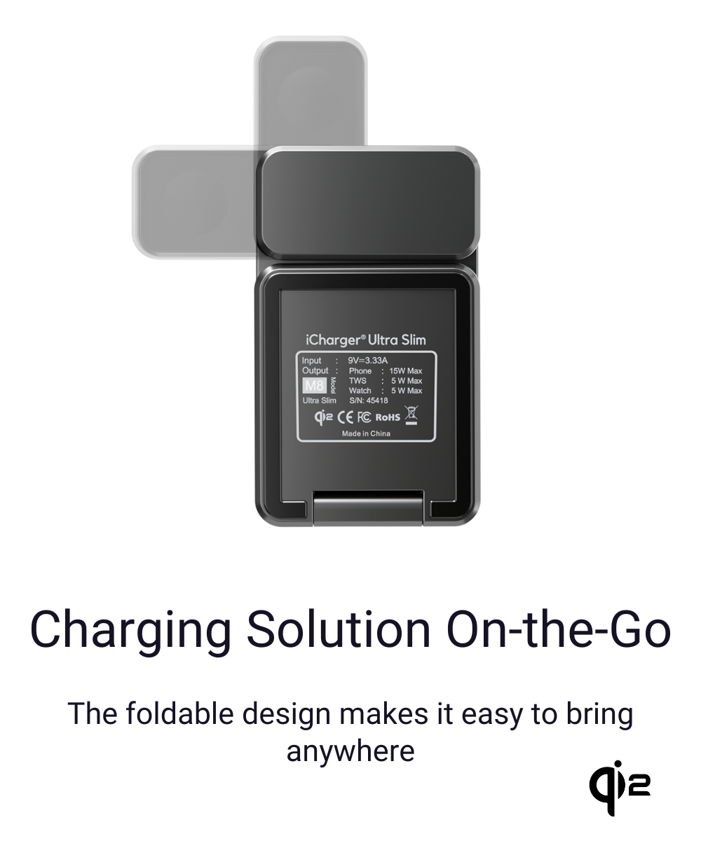 Introducing the iCharger Ultra Slim Qi2, a masterpiece in wireless charging. Precision-engineered from high-grade aluminum alloy, this charger delivers more than just power—it’s a statement of style, convenience, and innovation. Experience seamless charging for your iPhone, Apple Watch, and Qi-enabled earbuds, all in one sleek, foldable device.